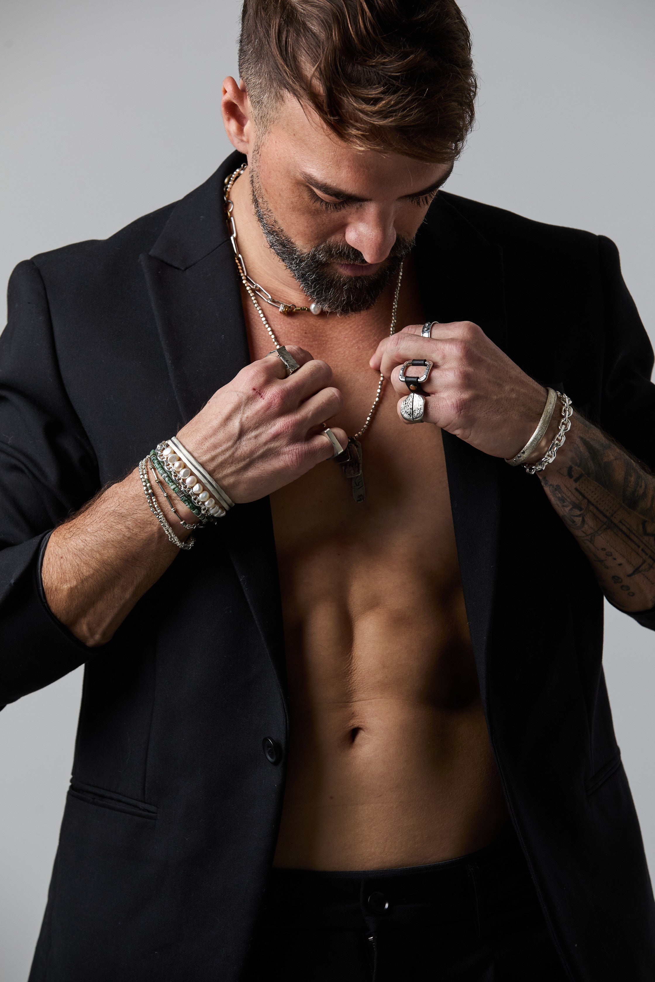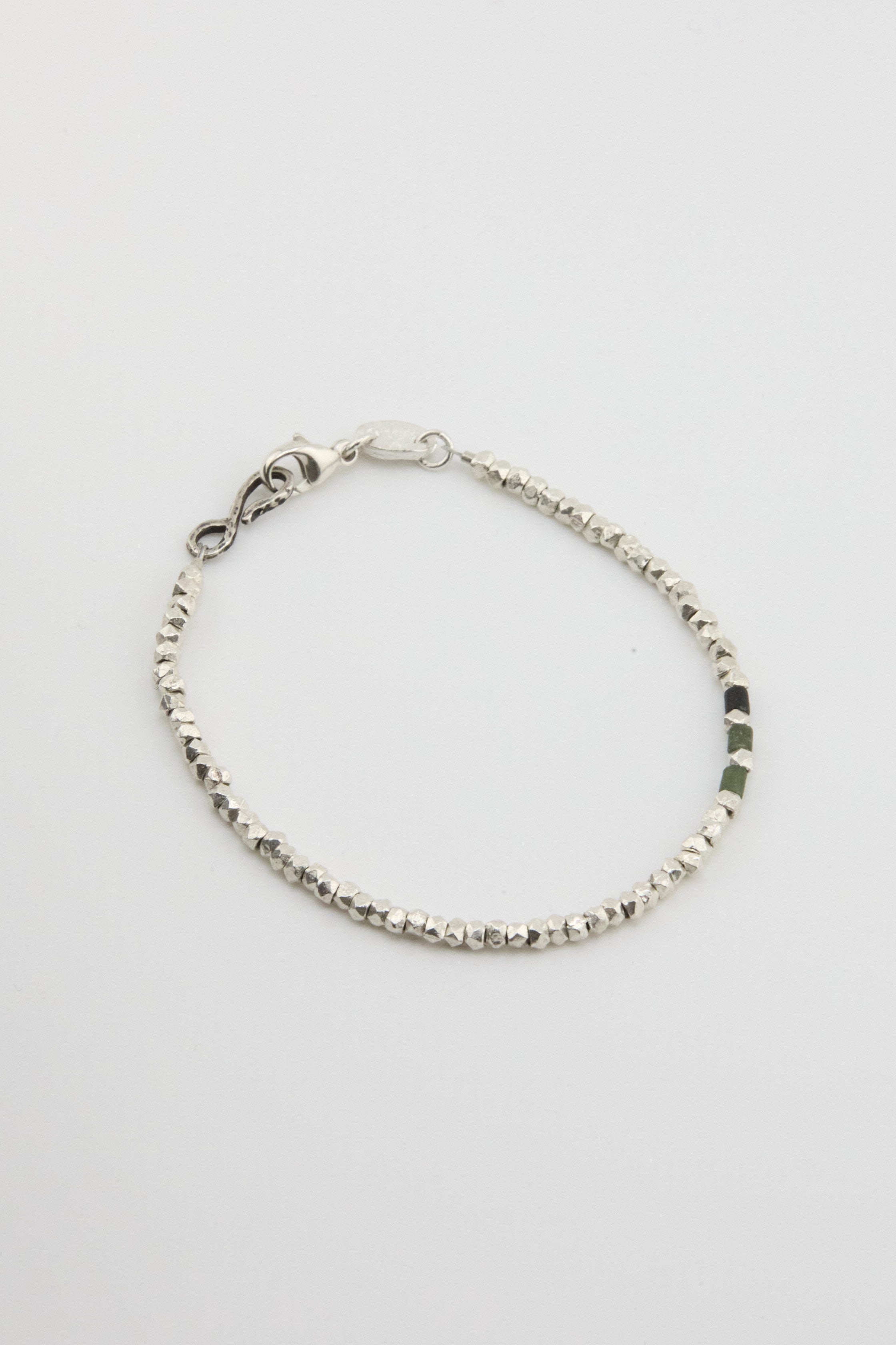 A delicate bracelet made of faceted silver nugget beads, designed to reflect light with subtle movement. A small green coral detail breaks the uniformity, adding a soft point of contrast.