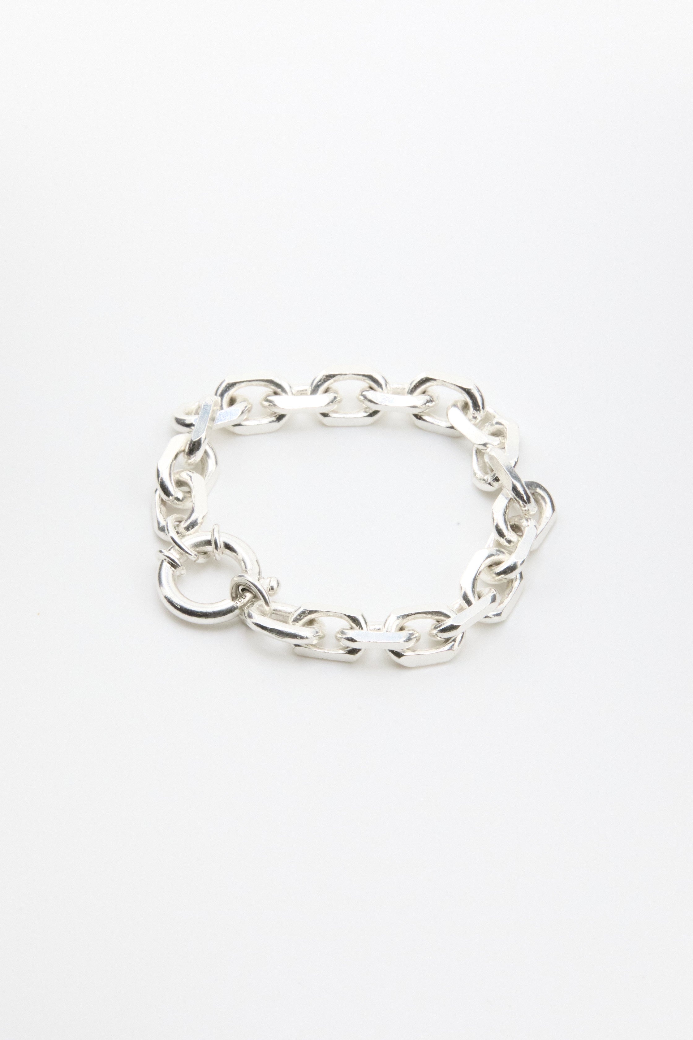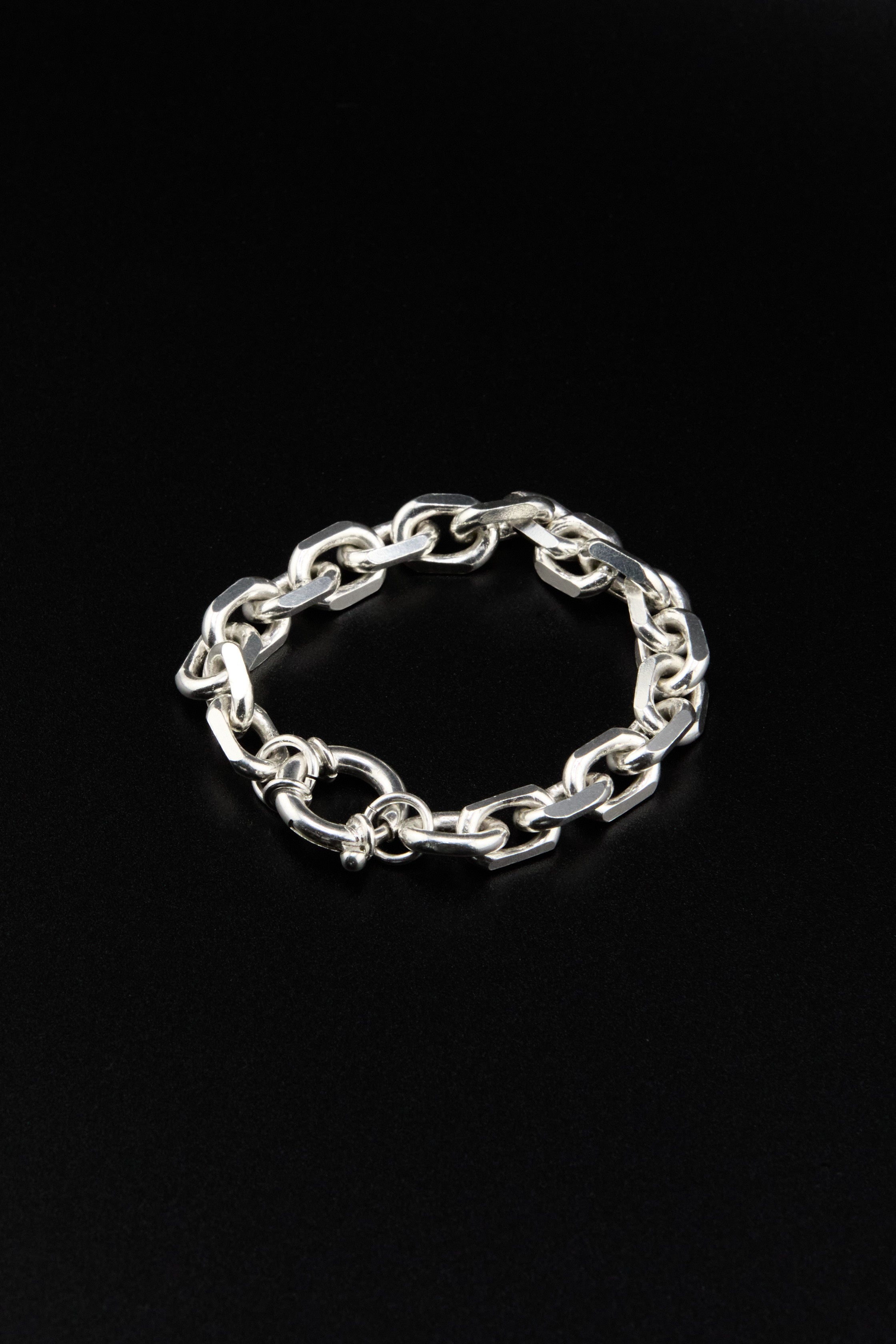 A bold chain made of unique silver links with a cut edge, combined with a chunky clasp.