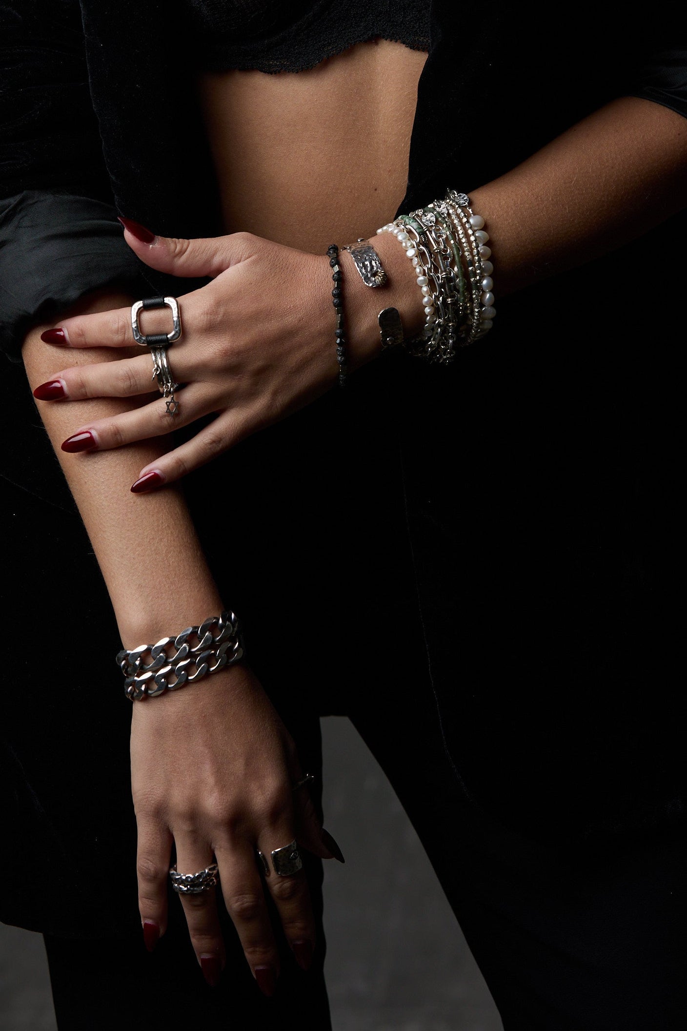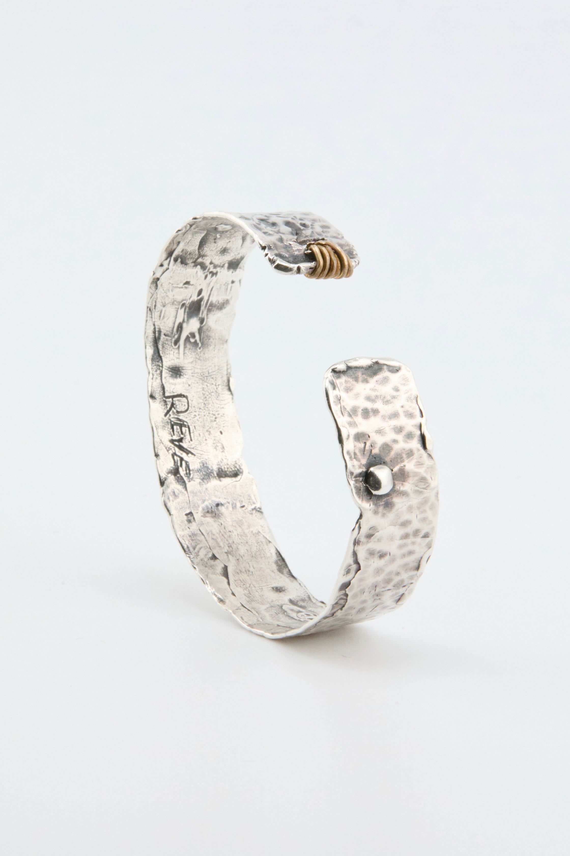 An industrial-inspired masterpiece, this handcrafted sterling silver cuff boasts a raw, textured surface that captures the beauty in imperfection. Its bold silhouette balances ruggedness and elegance, making it a striking statement piece for the modern rebel. Wear it as a symbol of strength and individuality.