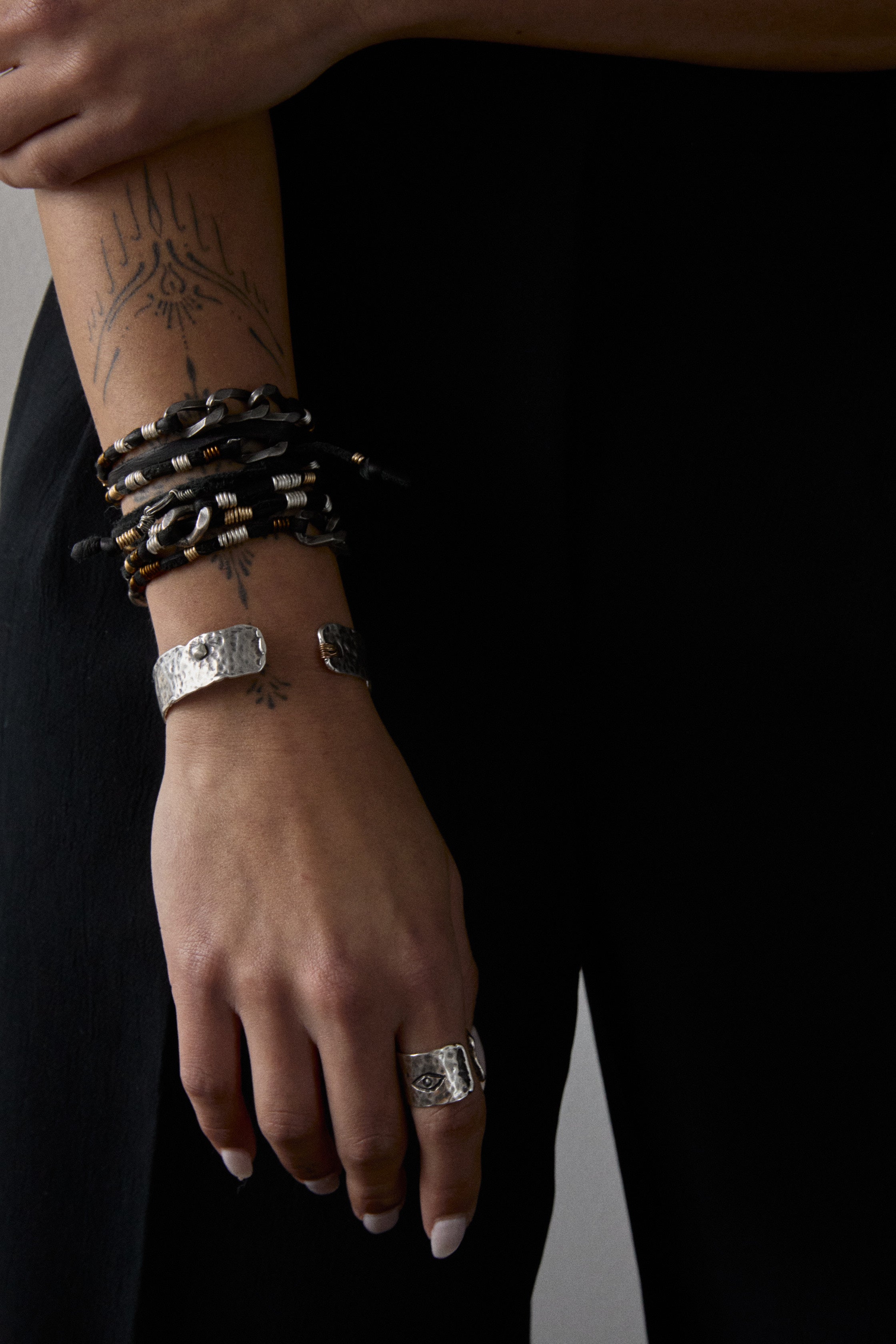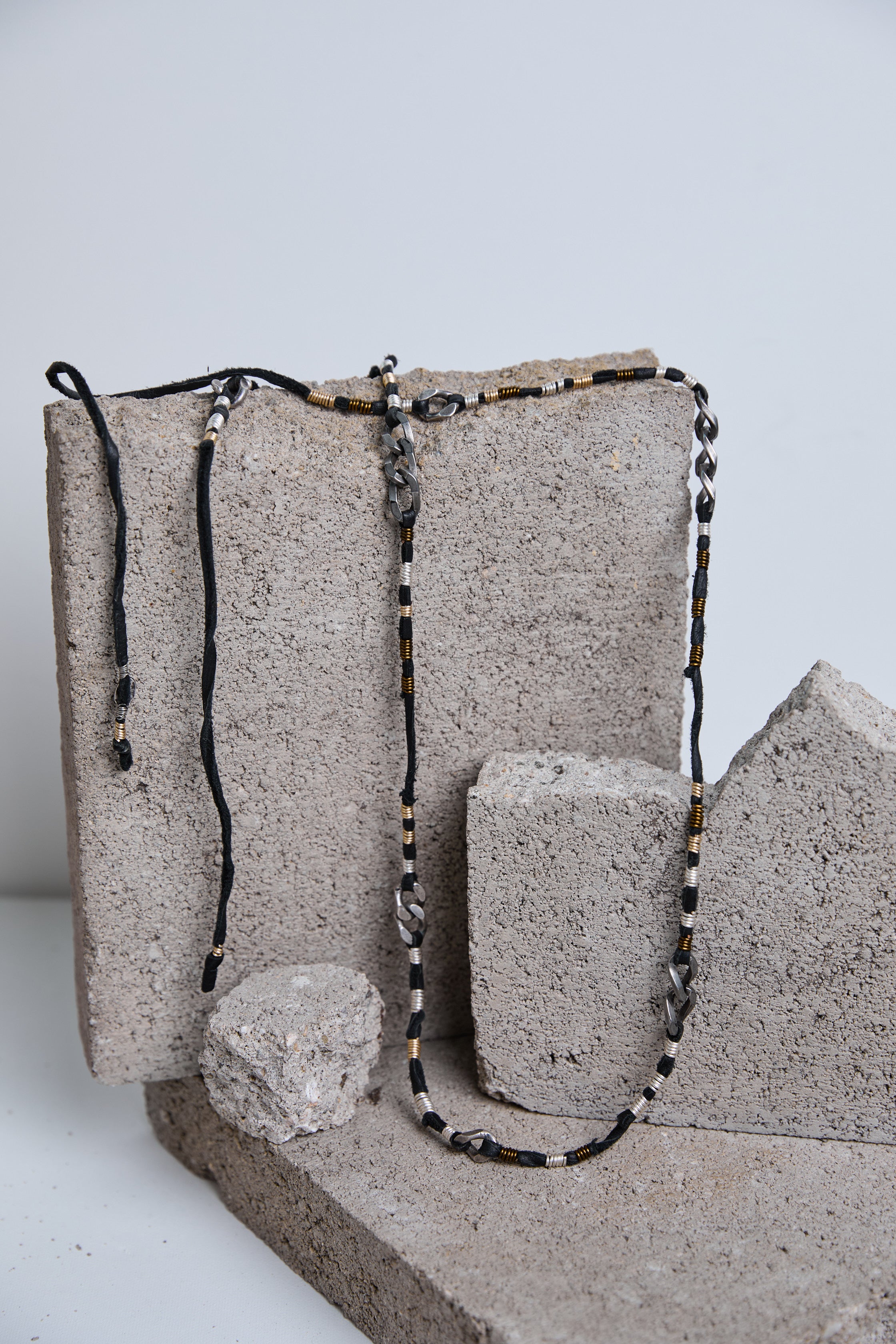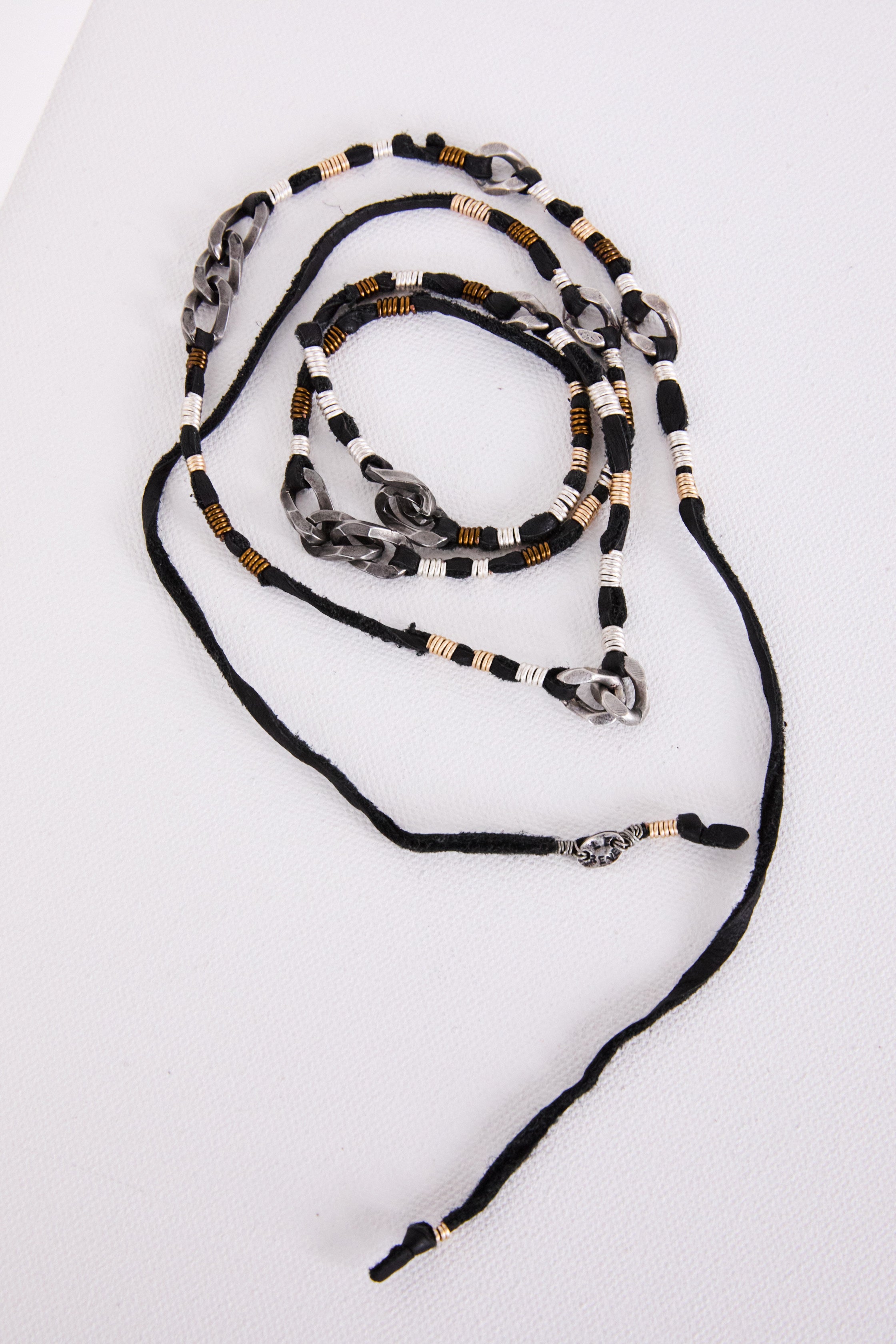 Versatile and on-trend, this layered wrap necklace can be styled an array of ways to suit your mood. Crafted with a mix of wire wrap, chain links, and a leather cord, it effortlessly elevates both casual and dressed-up looks. Its adjustable design makes it perfect for creating a personalized statement—wear it loose, layered, or wrapped tight for a unique, crafty vibe.