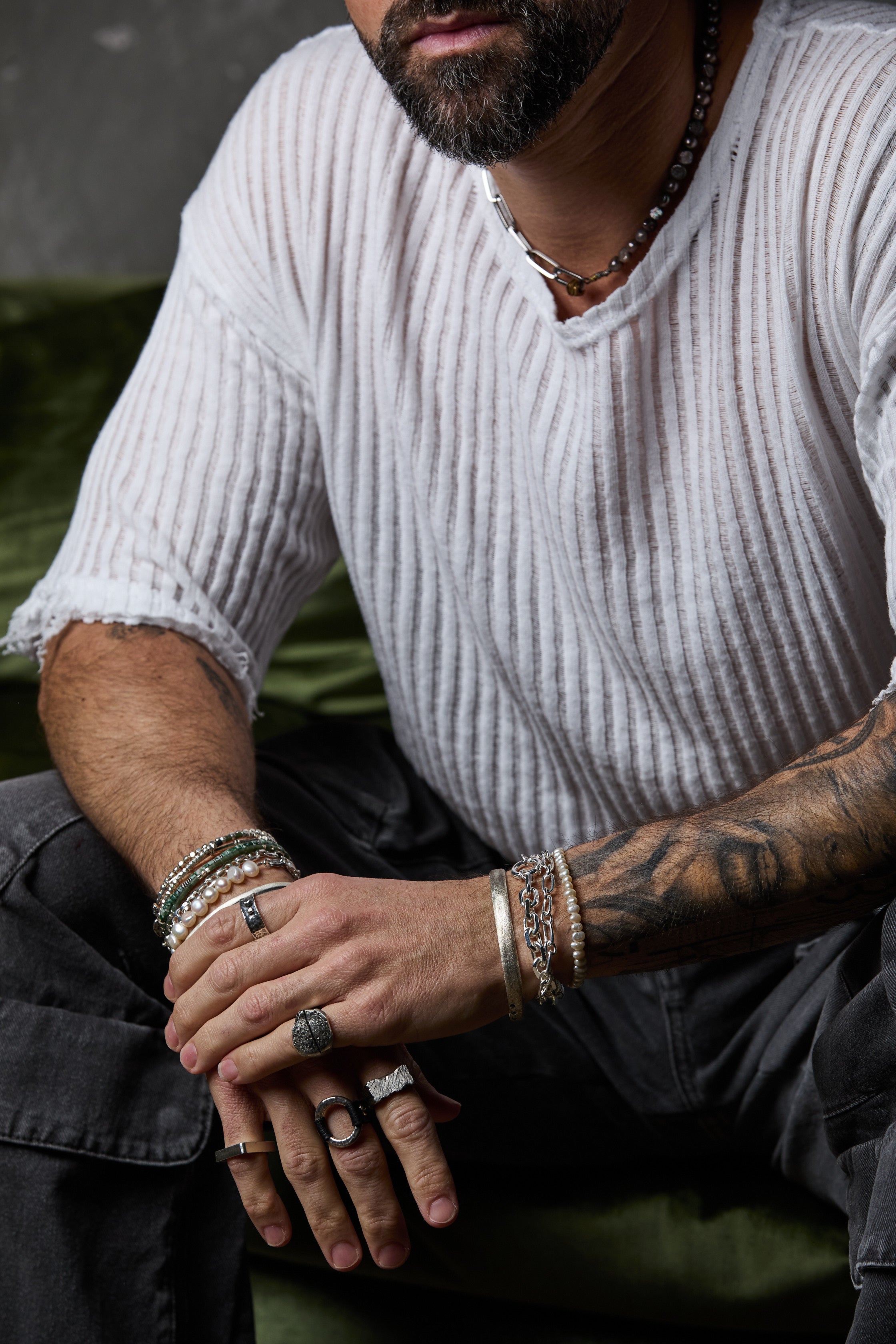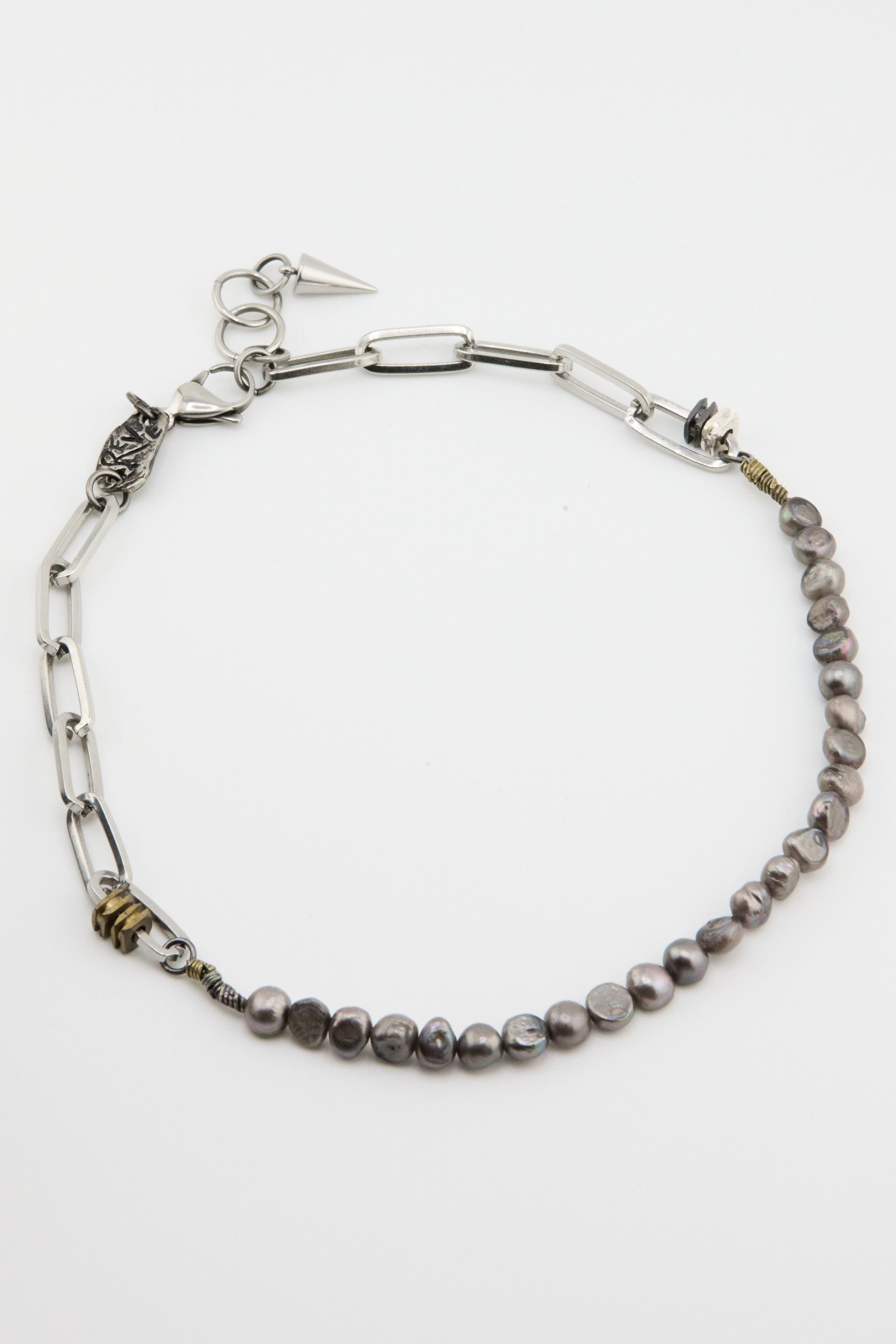 A striking piece that beautifully balances edgy and refined style. This necklace features a sleek silver chain accented with a delicate strand of lustrous purple pearls. The combination of bold metallic elements and organic pearls creates a sophisticated yet daring accessory—perfect for making a memorable statement. Whether layered or worn alone, this piece exudes confidence and unique elegance.
