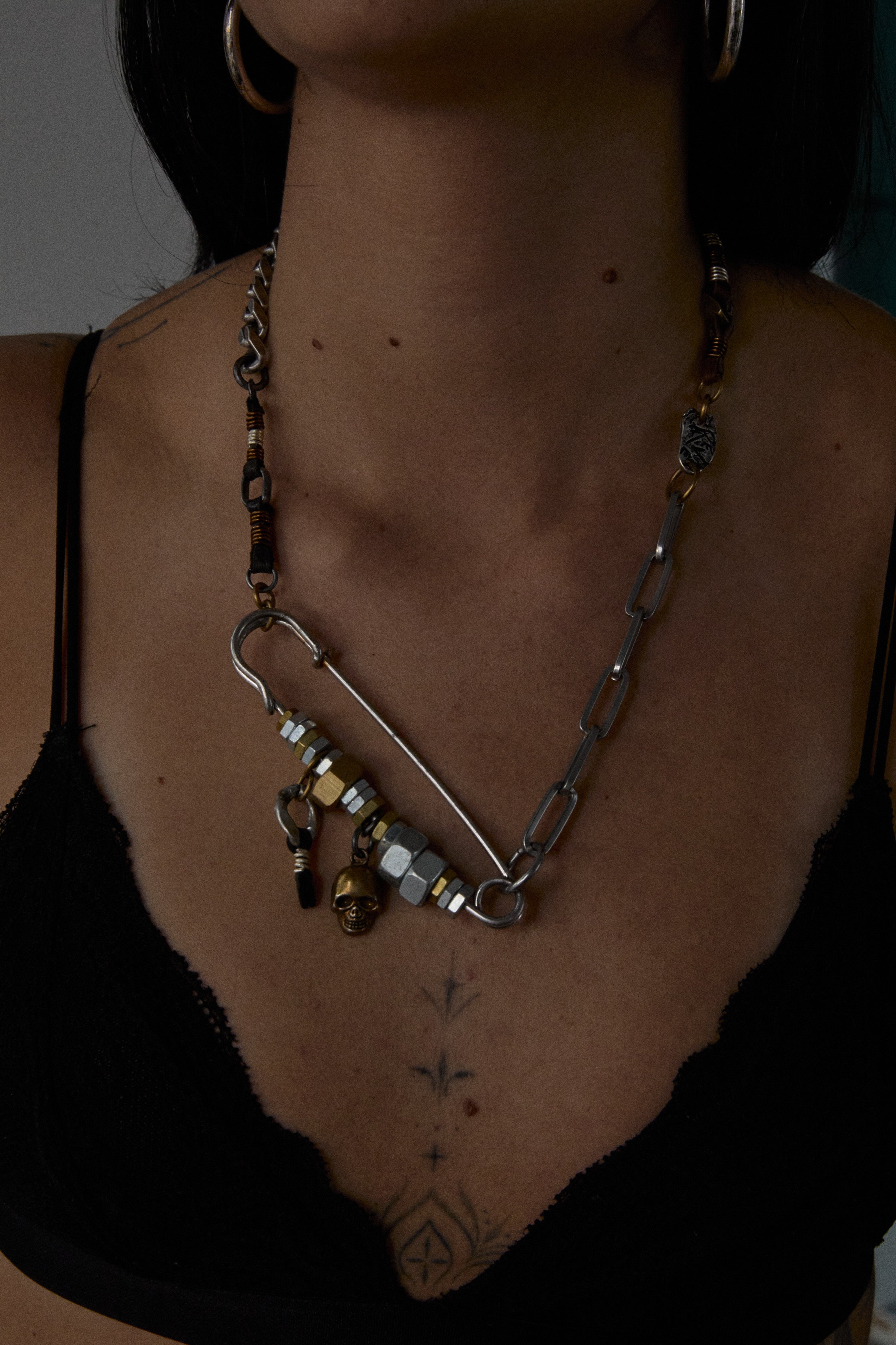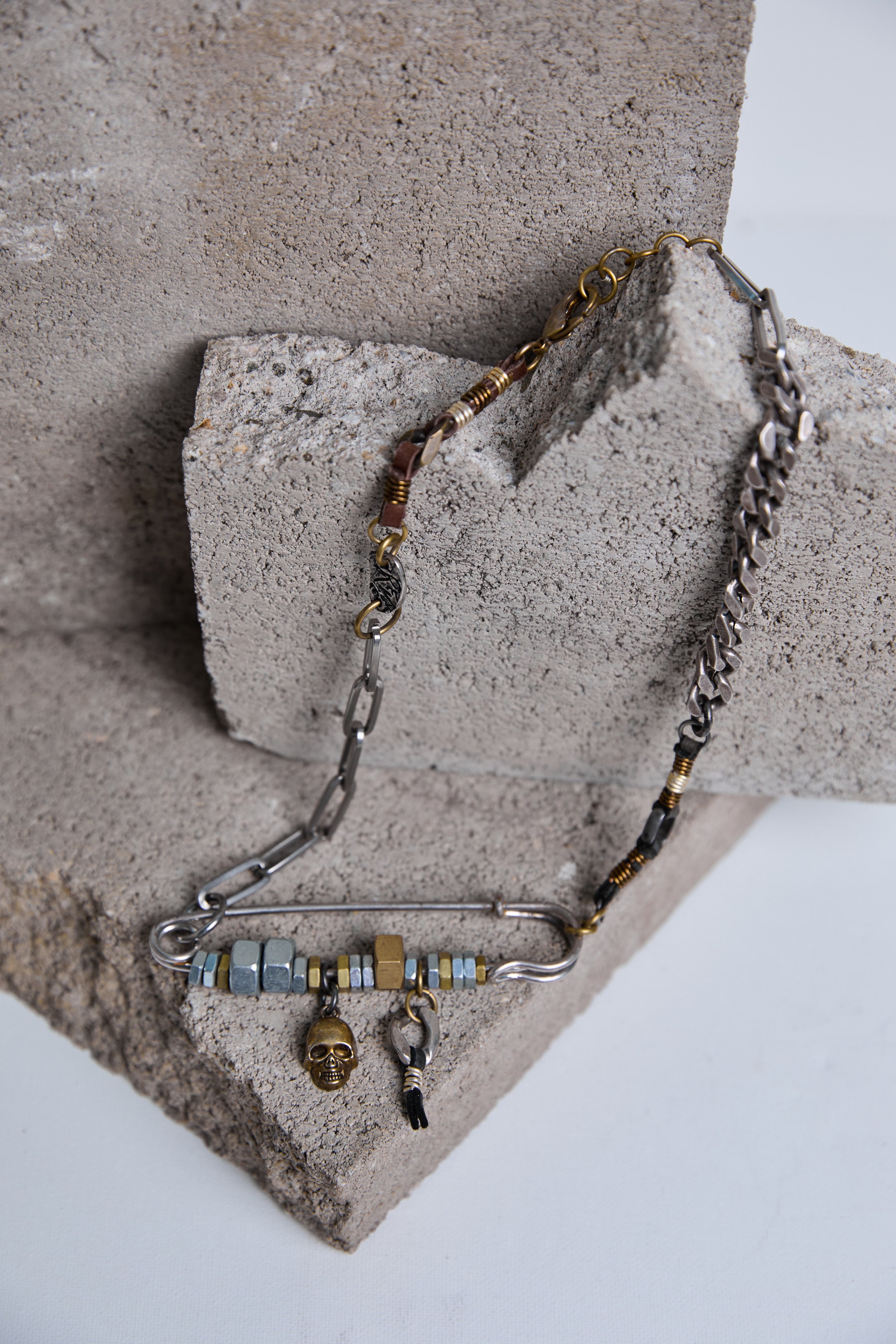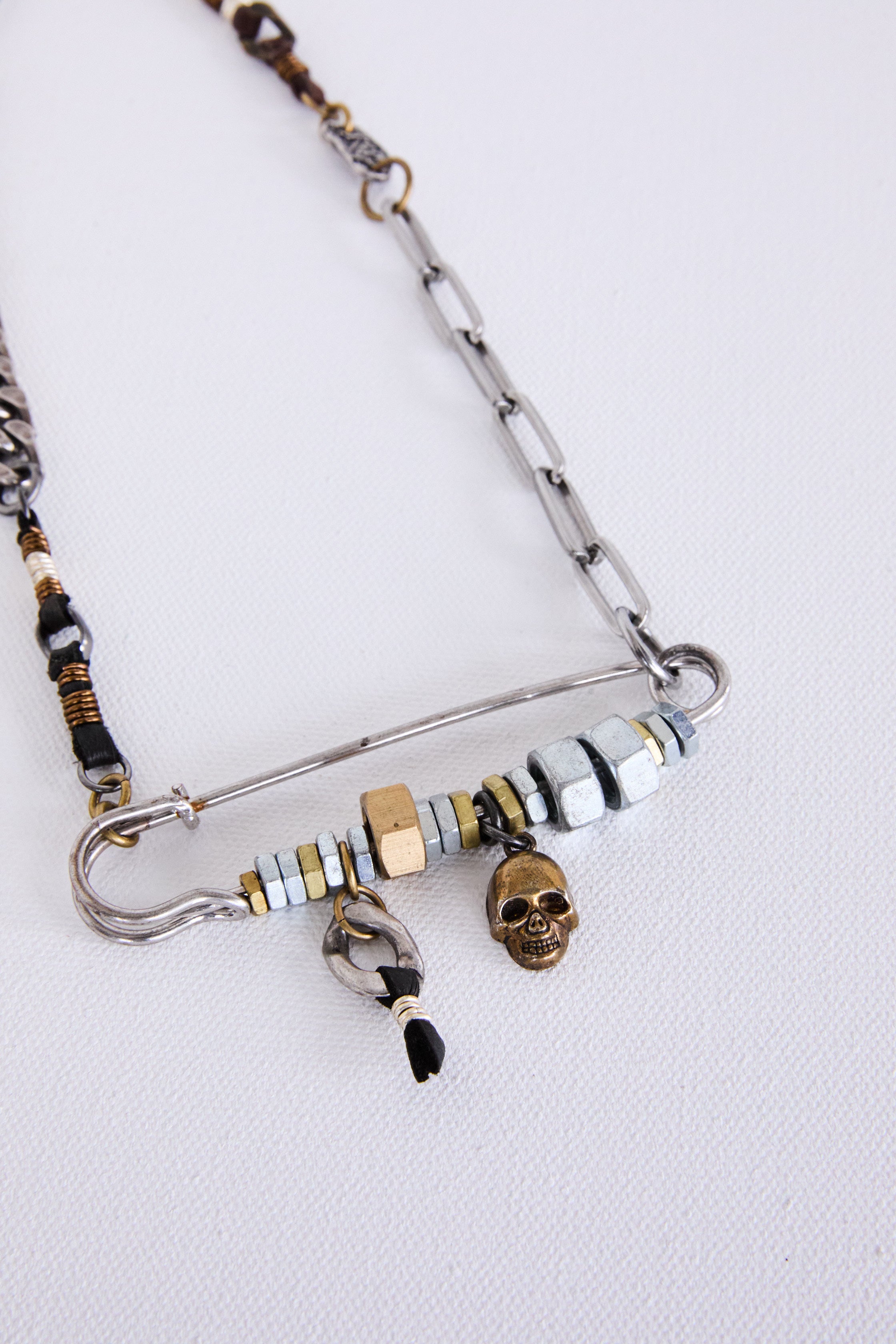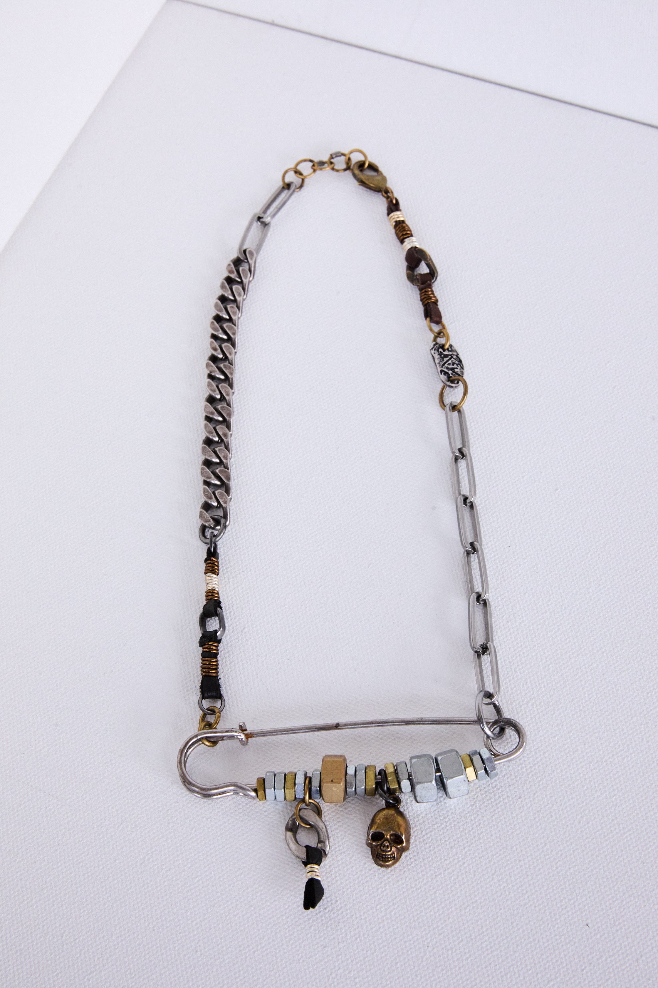 DescriptionA statement of raw attitude and style, this layered chain features a mix of chunky metal links, beaded accents, and a signature safety pin detail. Crafted to elevate your look with rebellious charm, it’s the perfect accessory for those who dare to stand out. Make your mark with this fearless piece—crafted for the free spirits and rule-breakers. Sterling silver 92.5, Brass, metal screws, leather accents
