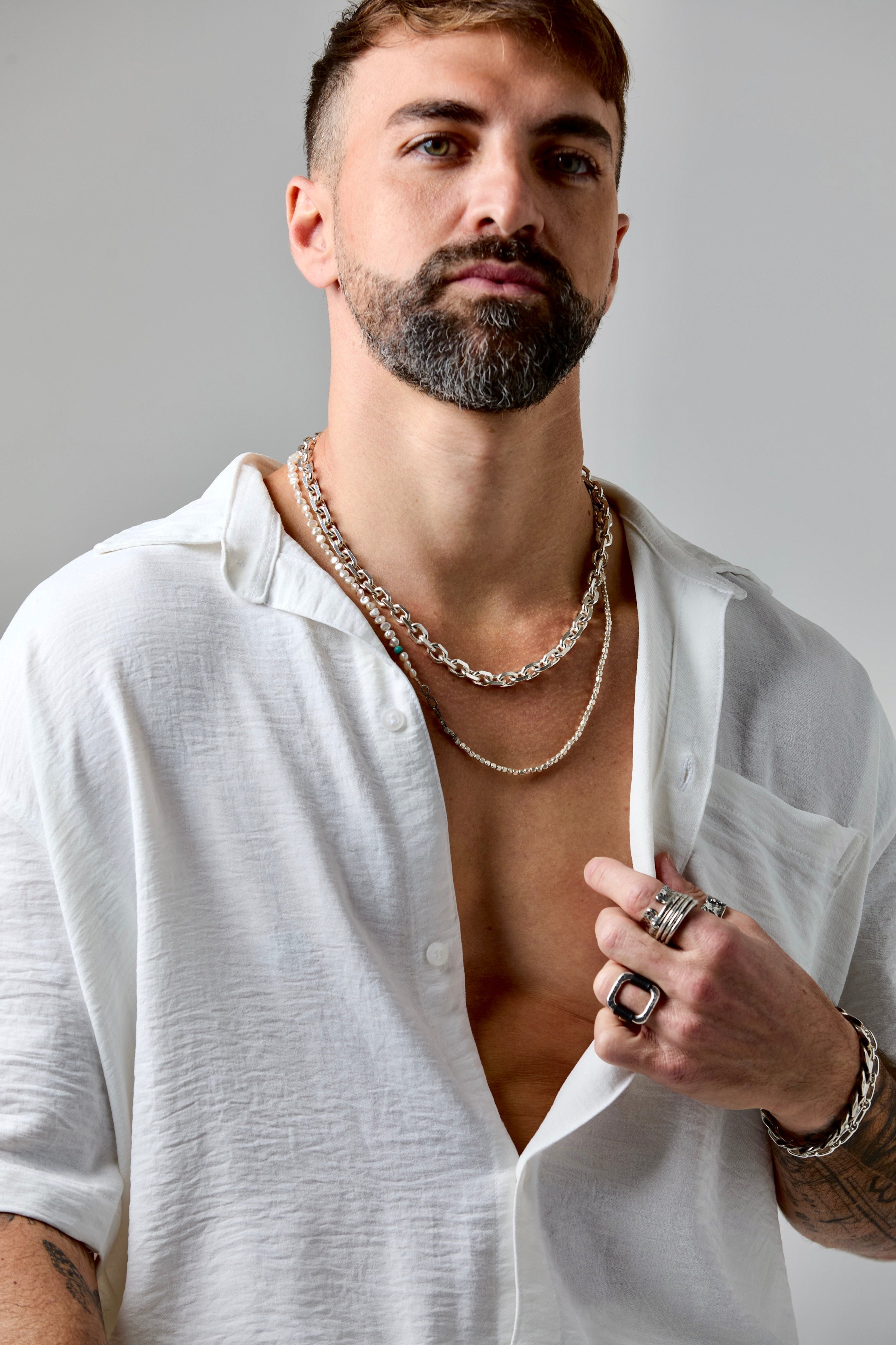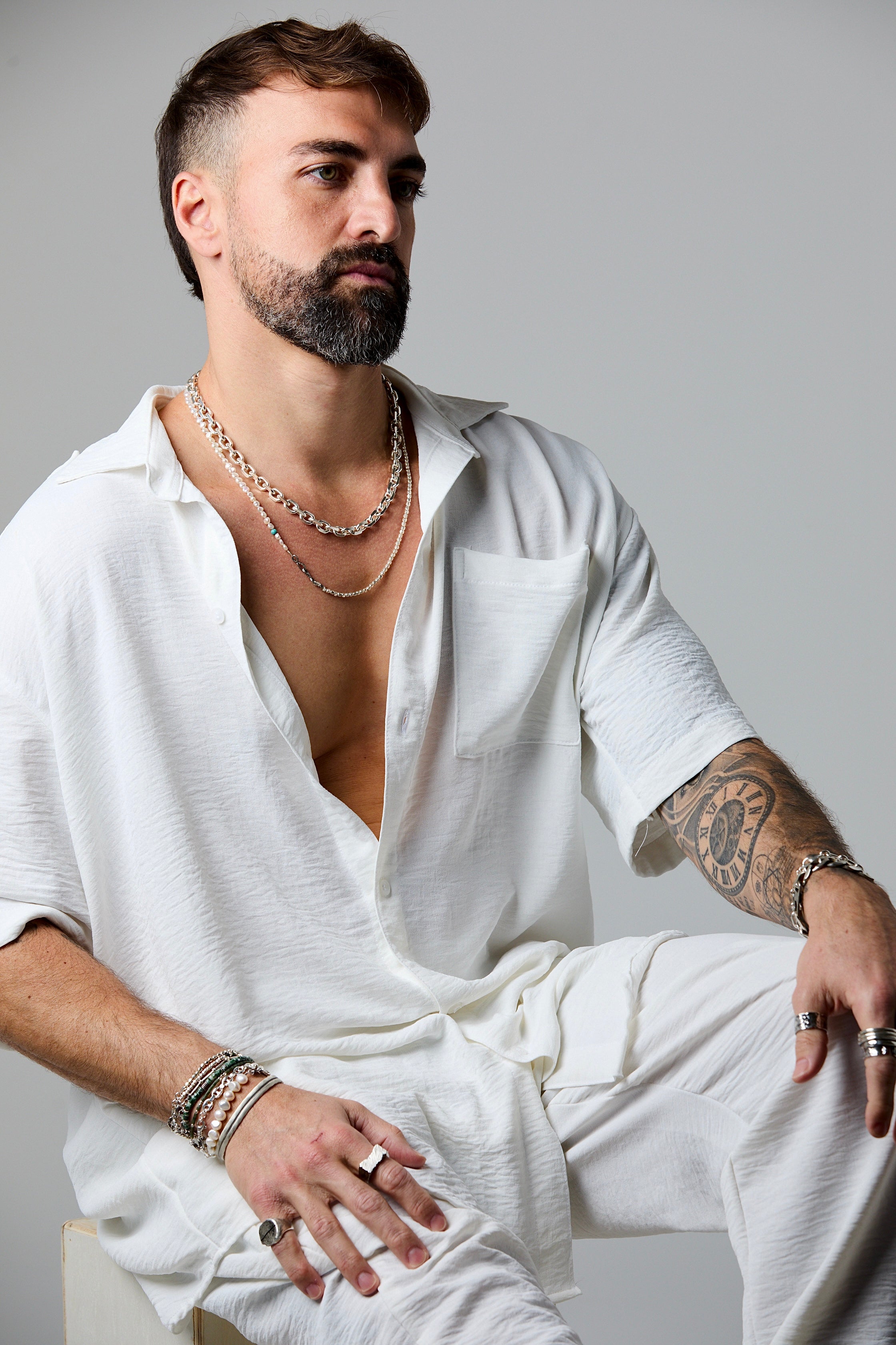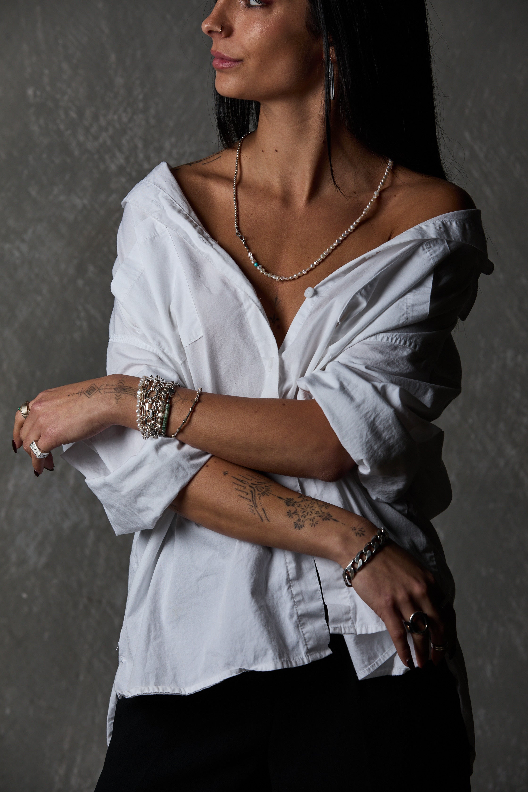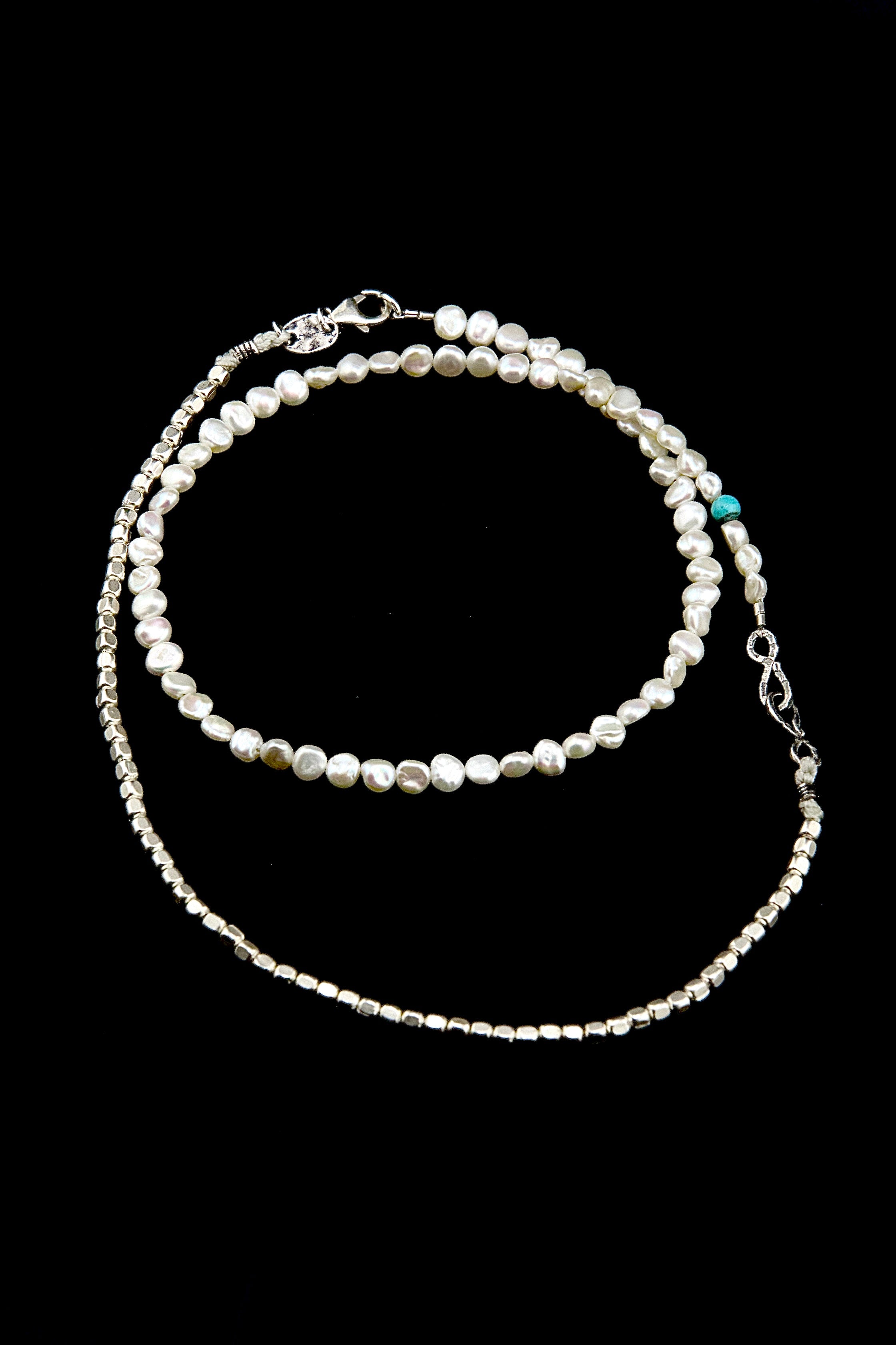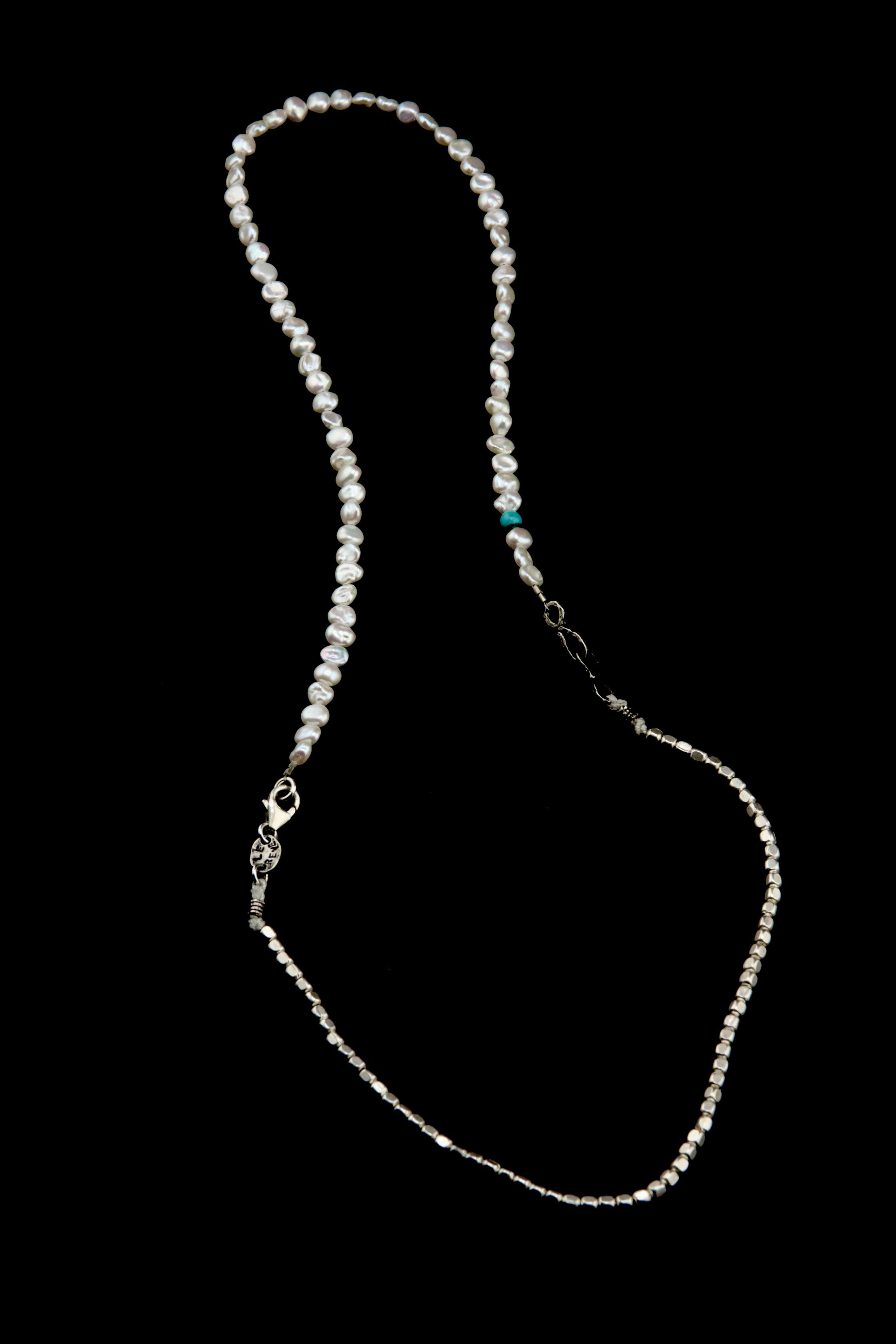 An organic dance of pearls, chain, and a hint of african turquoise. This piece invites you to redefine what jewelry can be. Wrap it, layer it, or let it drape—an invitation to express your unique rhythm. Crafted to move with you, it’s a wearable moment of free-flowing artistry and untamed spirit.