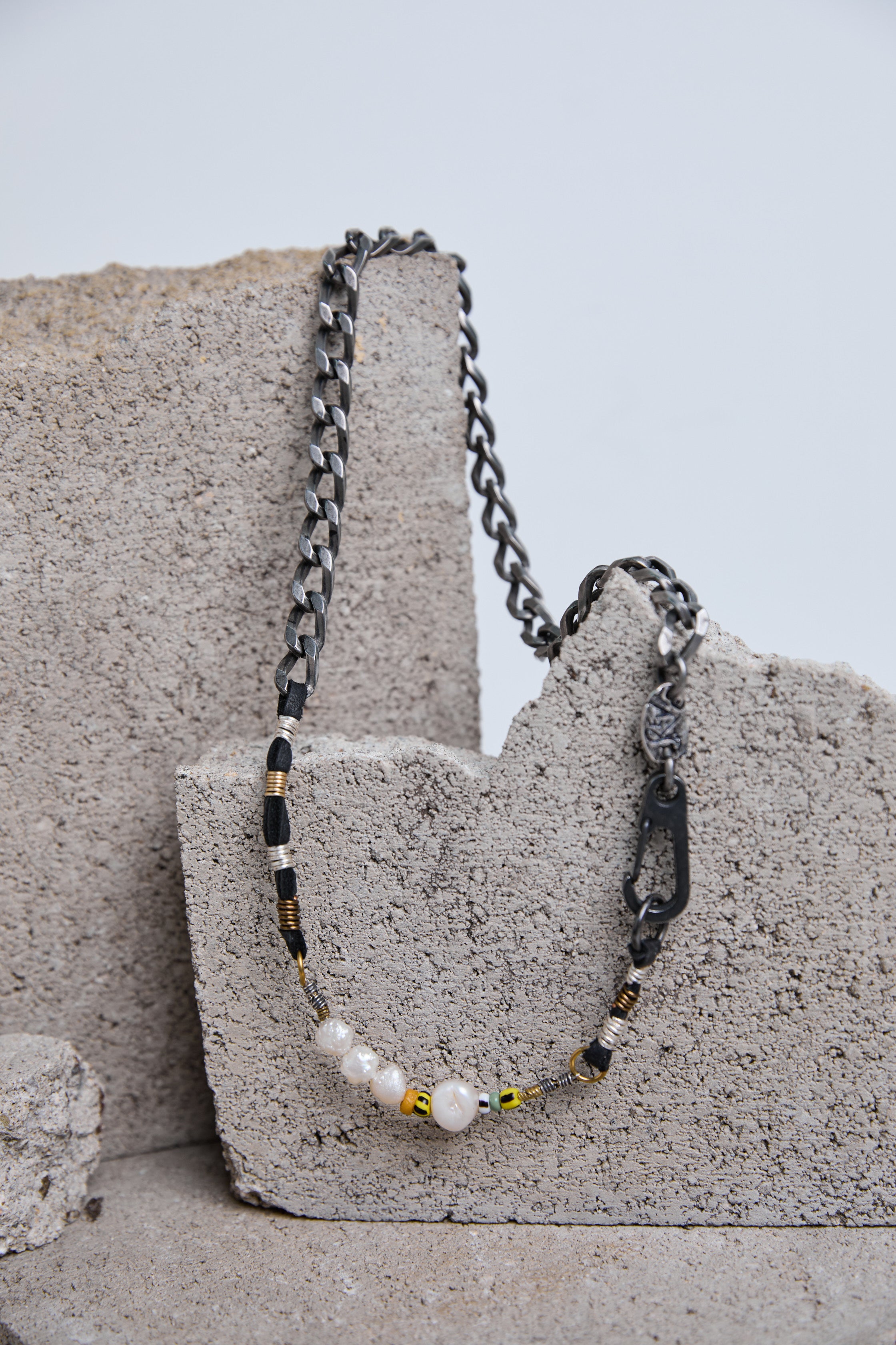 DescriptionAn organic dance of beads, pearls, and chain, this piece invites you to redefine what jewelry can be. Wrap it, layer it, or let it drape—an invitation to express your unique rhythm. Crafted to move with you, it’s a wearable moment of free-flowing artistry and untamed spirit. Oxidized Stainless Steel Chain, Natural African Pearls, Authentic African Beads