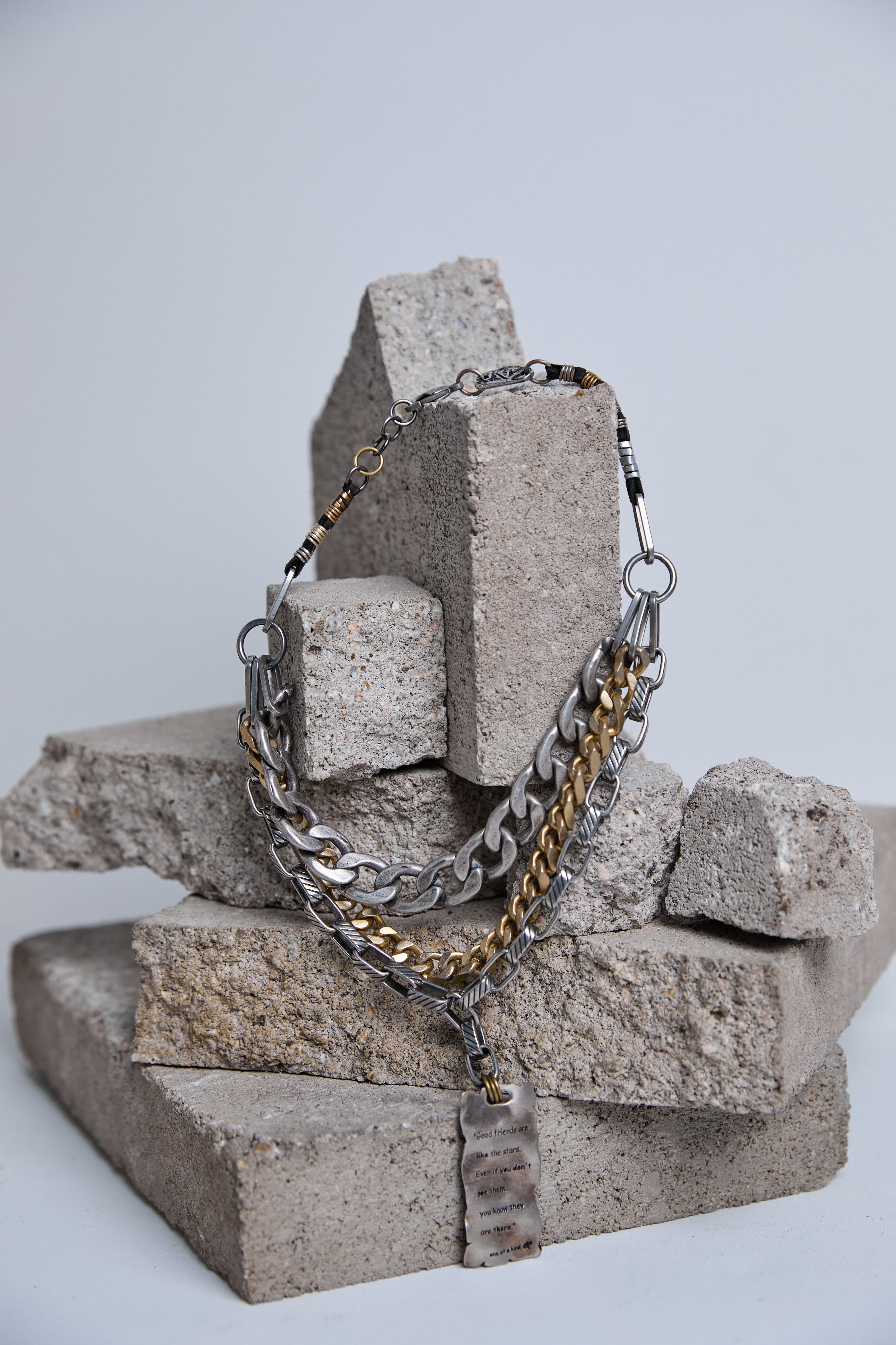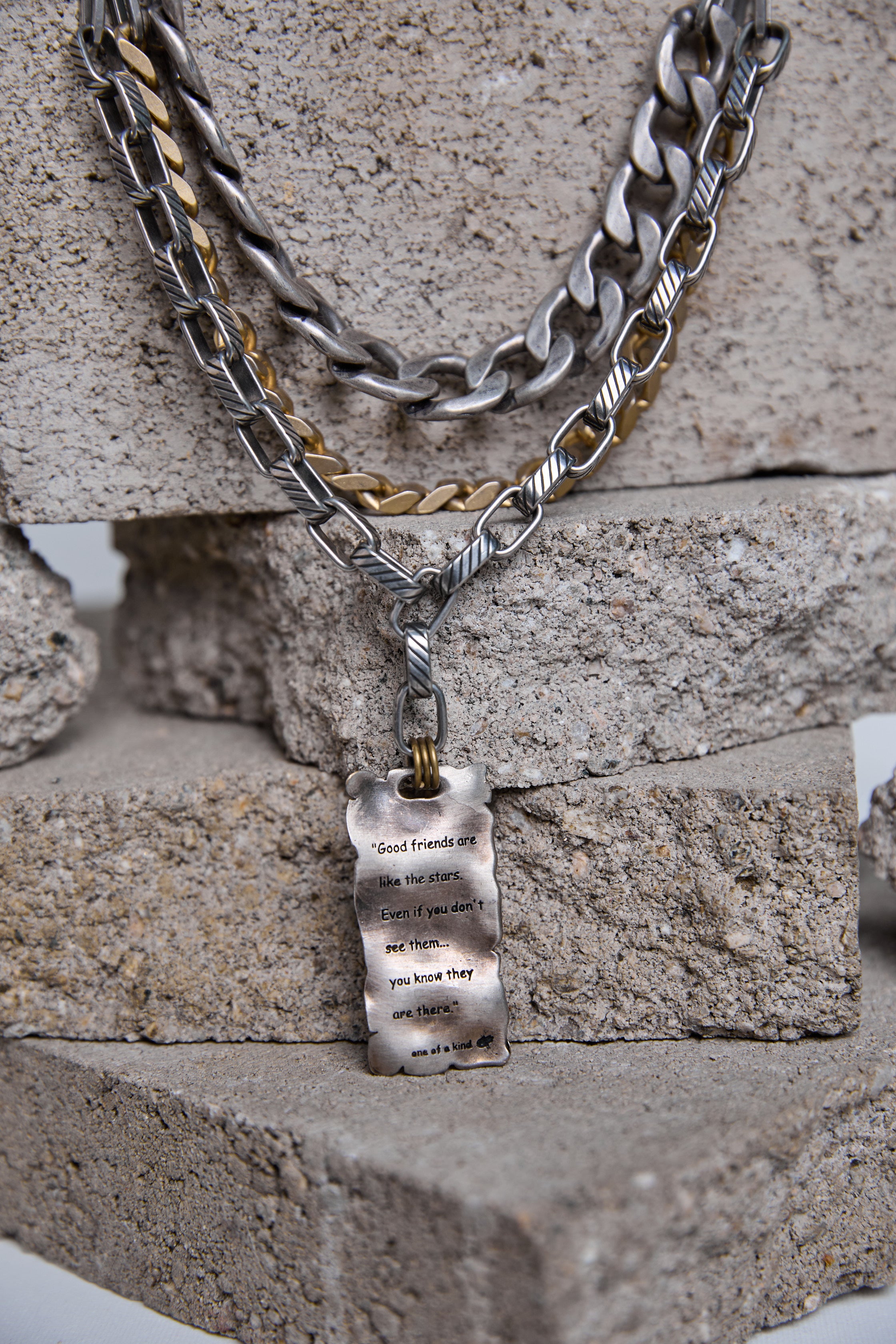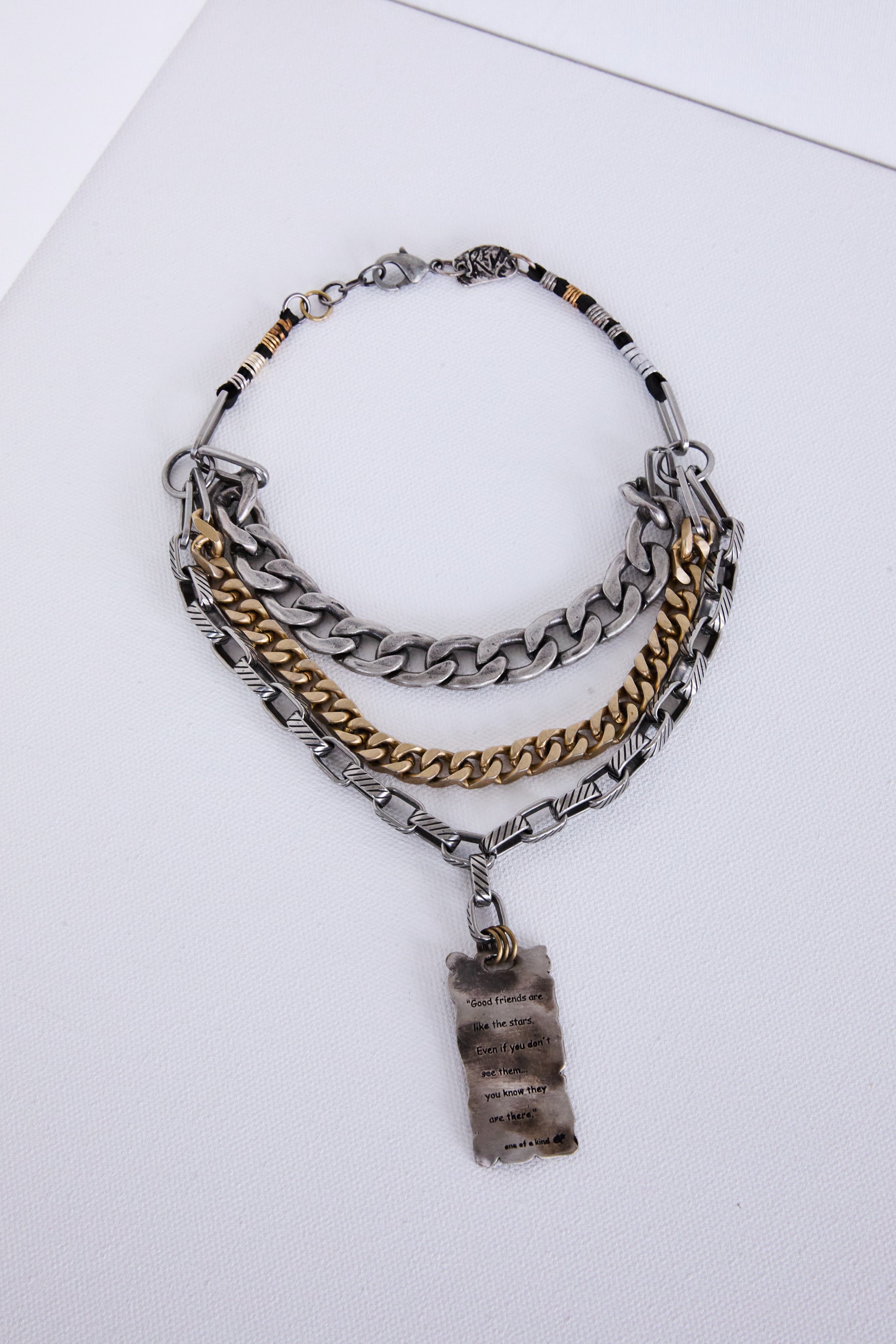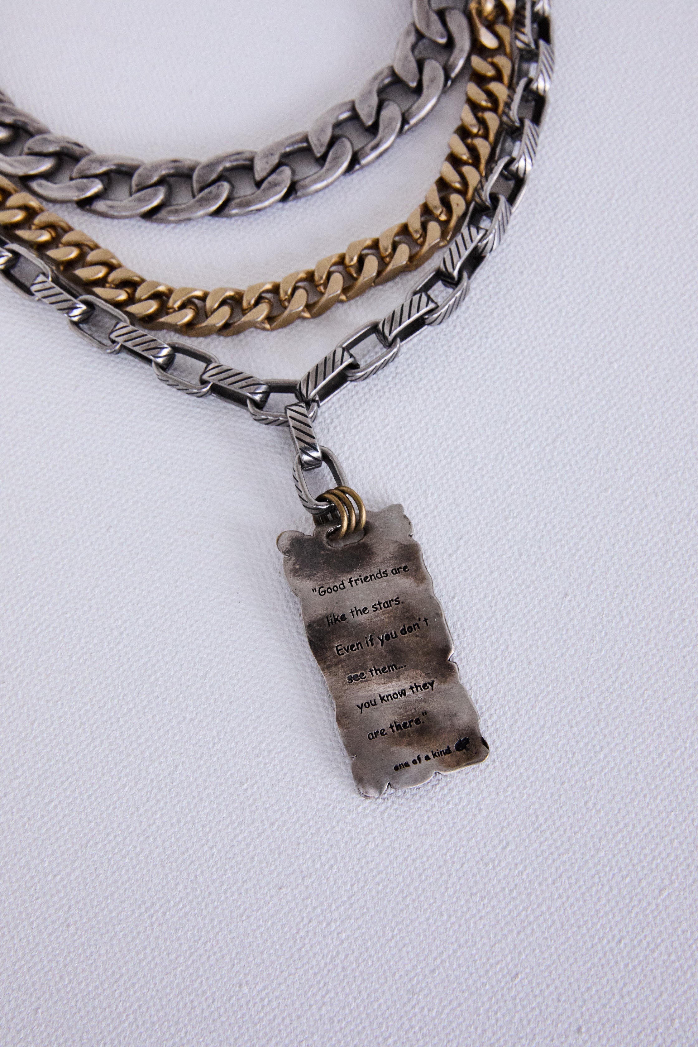 Discover the perfect blend of style and meaning with this dual-tone layered necklace. Featuring silver and gold chains, this piece exudes elegance and sophistication. The standout feature is a beautifully crafted pendant inscribed with an inspiring message: "Good friends are like the stars, Even if you don’t see them, you know they are there." A tribute to friendship.