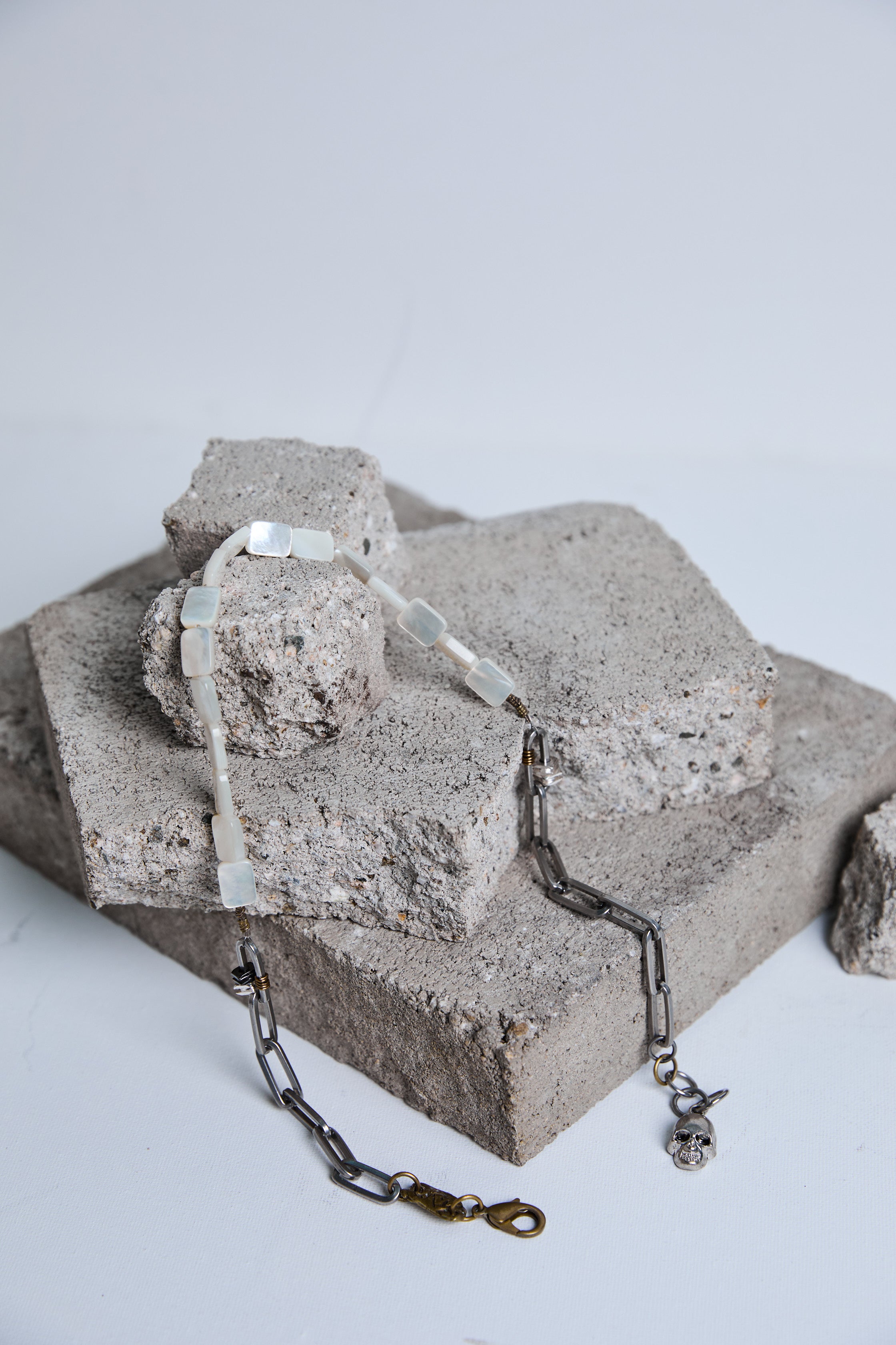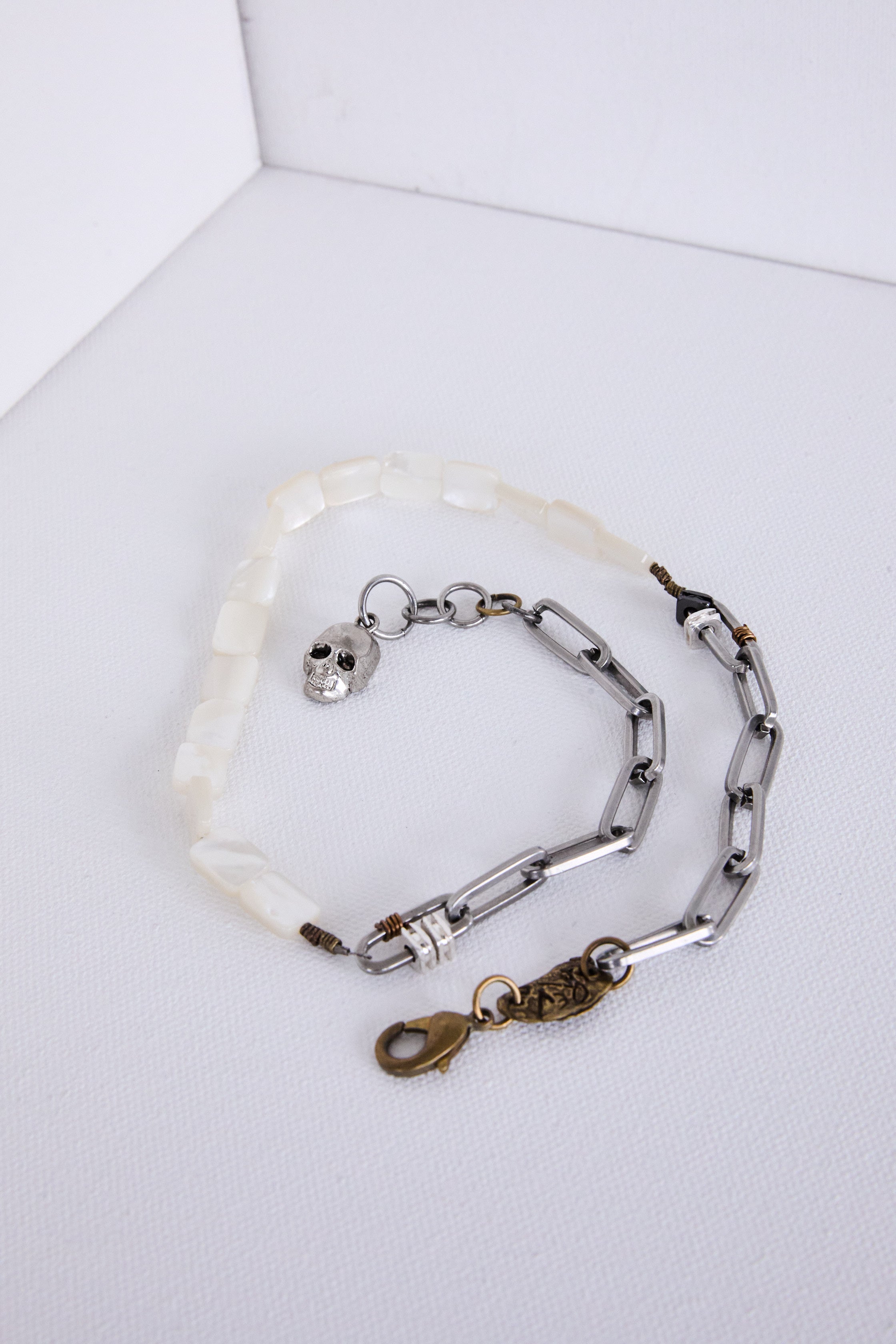 DescriptionElevate your style with this striking choker necklace. Featuring an edgy combination of chunky metallic links and smooth ivory-toned pearls, this piece is sure to make a statement. The bold skull charm adds a touch of rebellious flair, making it the perfect accessory for those who dare to be different. With its unique design, this necklace is versatile enough to complement both casual and dressy outfits. Securely fastened with a robust clasp, it promises both style and durability for every occasion. Natural Flat Shells, Handmade Stainless Steel Chain & Charms