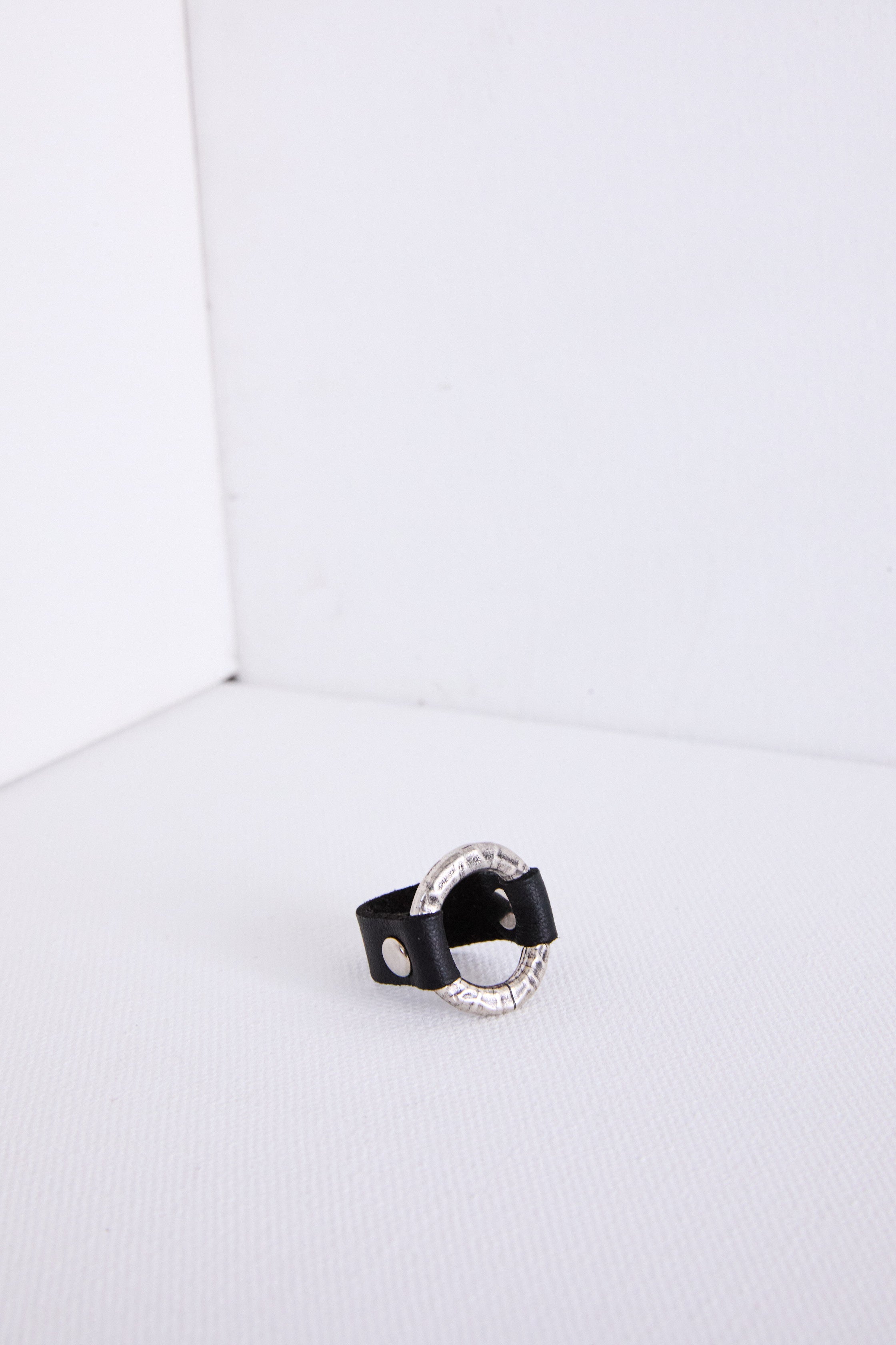 A bold, handcrafted ring featuring a rugged leather band and a textured silver element. Perfect for adding an edgy yet sophisticated touch to your everyday style. Comes in Circle or Square.