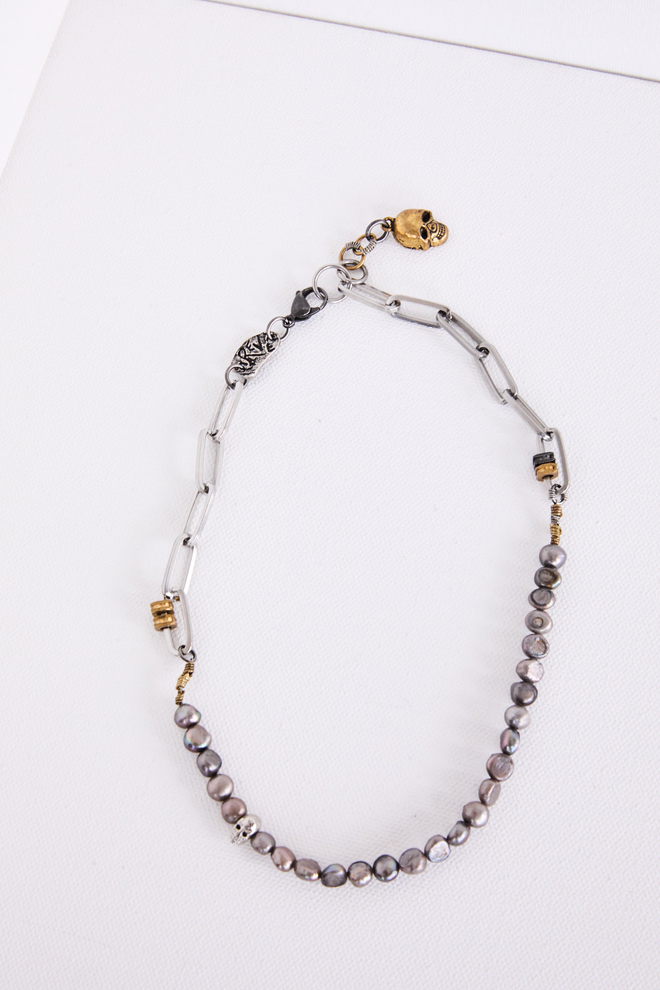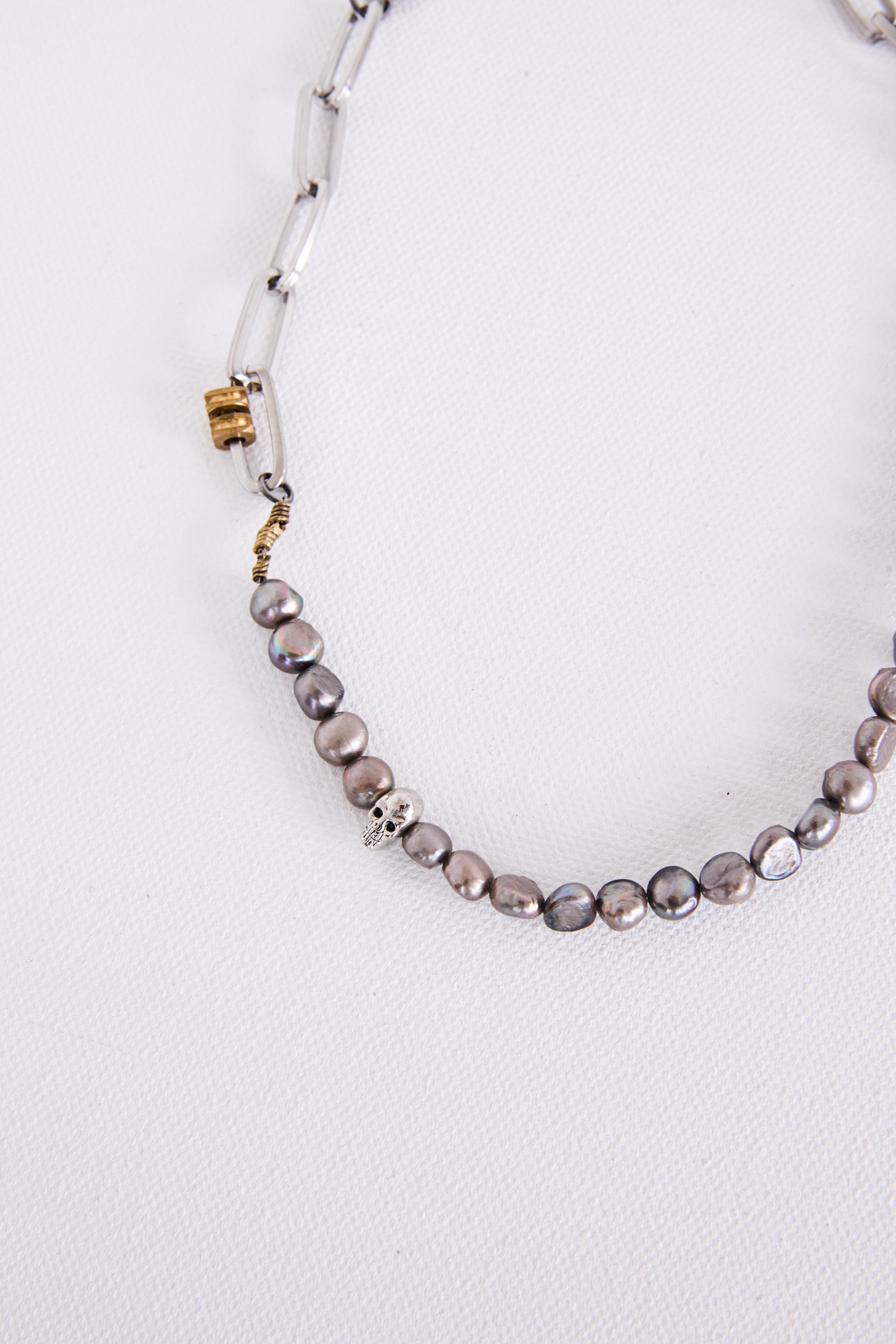DescriptionA striking piece that beautifully balances edgy and refined style. This necklace features a sleek silver chain accented with a delicate strand of lustrous, purple pearls and a small, intricate skull charm. The combination of bold metallic elements and organic pearls creates a sophisticated yet daring accessory—perfect for making a memorable statement. Whether layered or worn alone, this piece exudes confidence and unique elegance. Natural Freshwater Pearls, Authentic African Beads, Stainless Steel Chain, Brass Accents